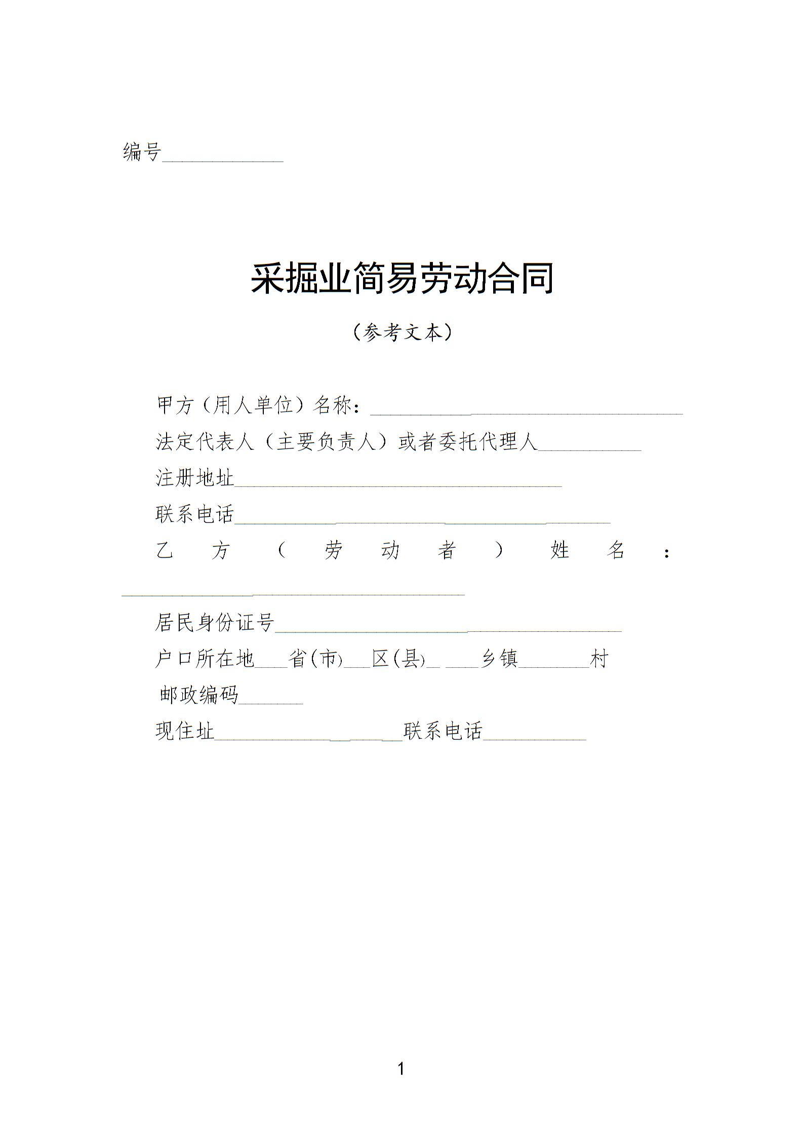 采掘业简易劳动合同(参考文本)