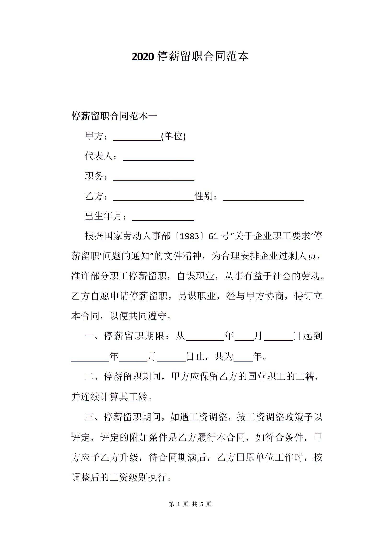 2020停薪留职合同范本