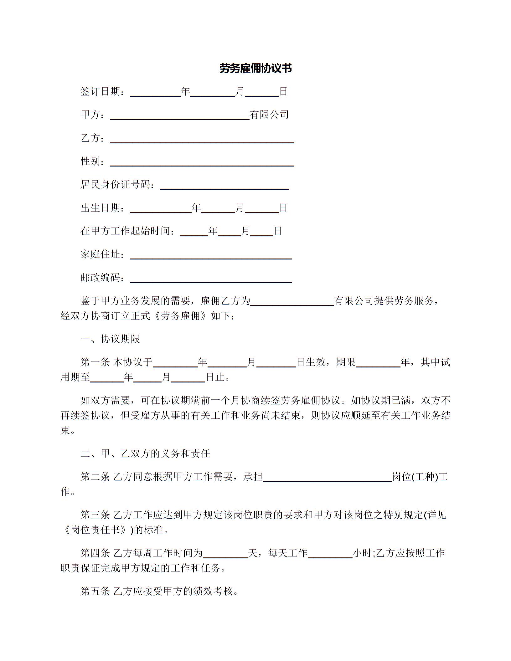 劳务雇佣协议书