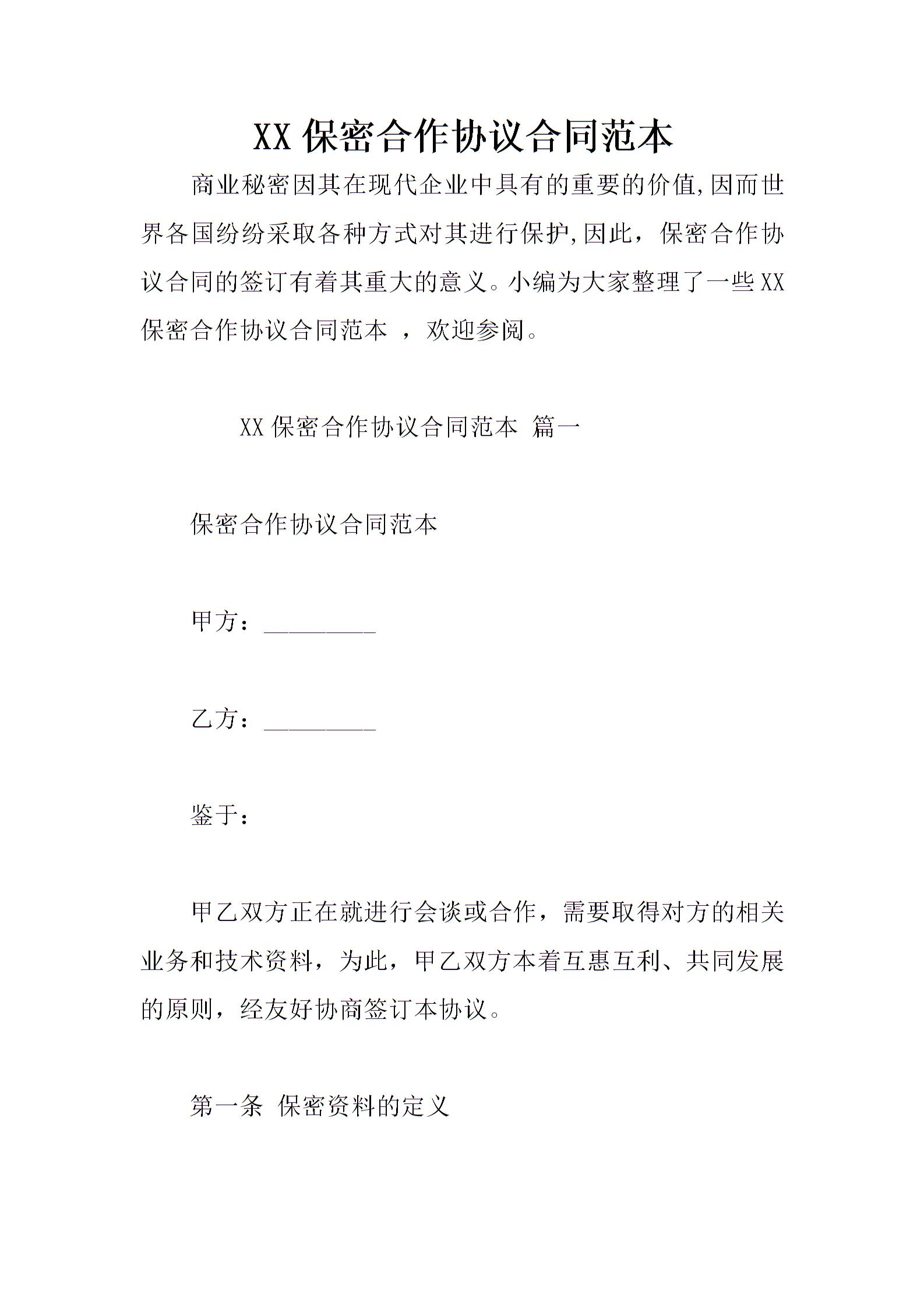 XX保密合作协议合同范本