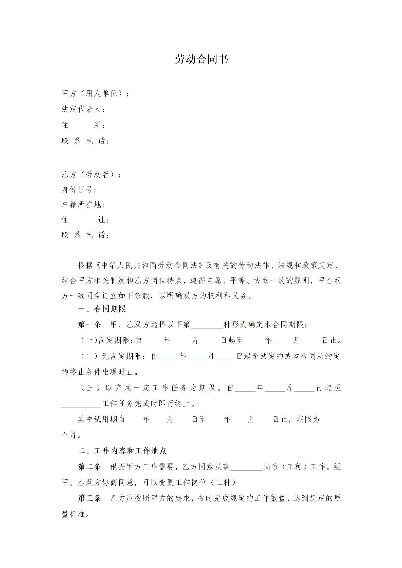 劳动合同书模板