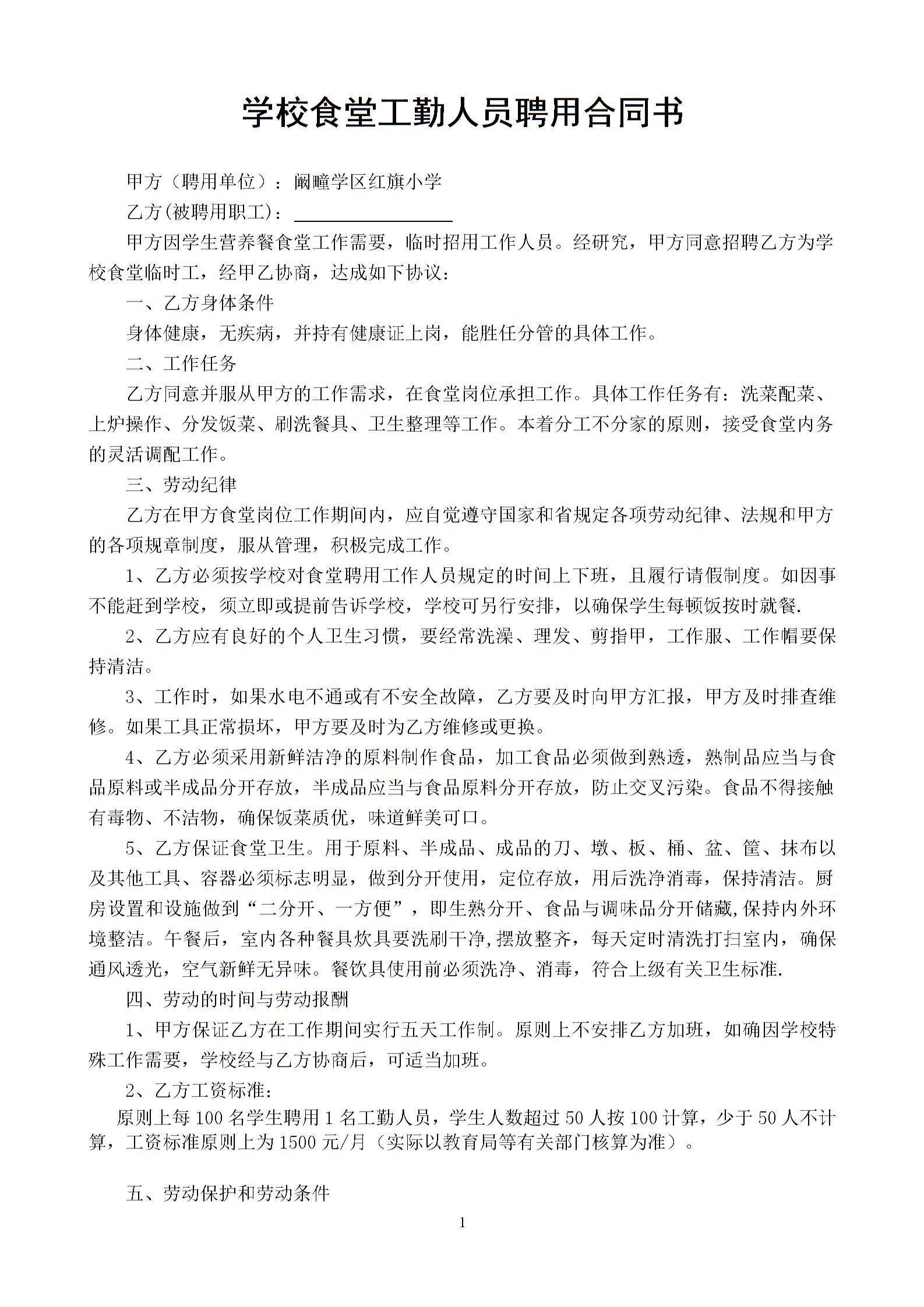学校食堂工人聘用合同书