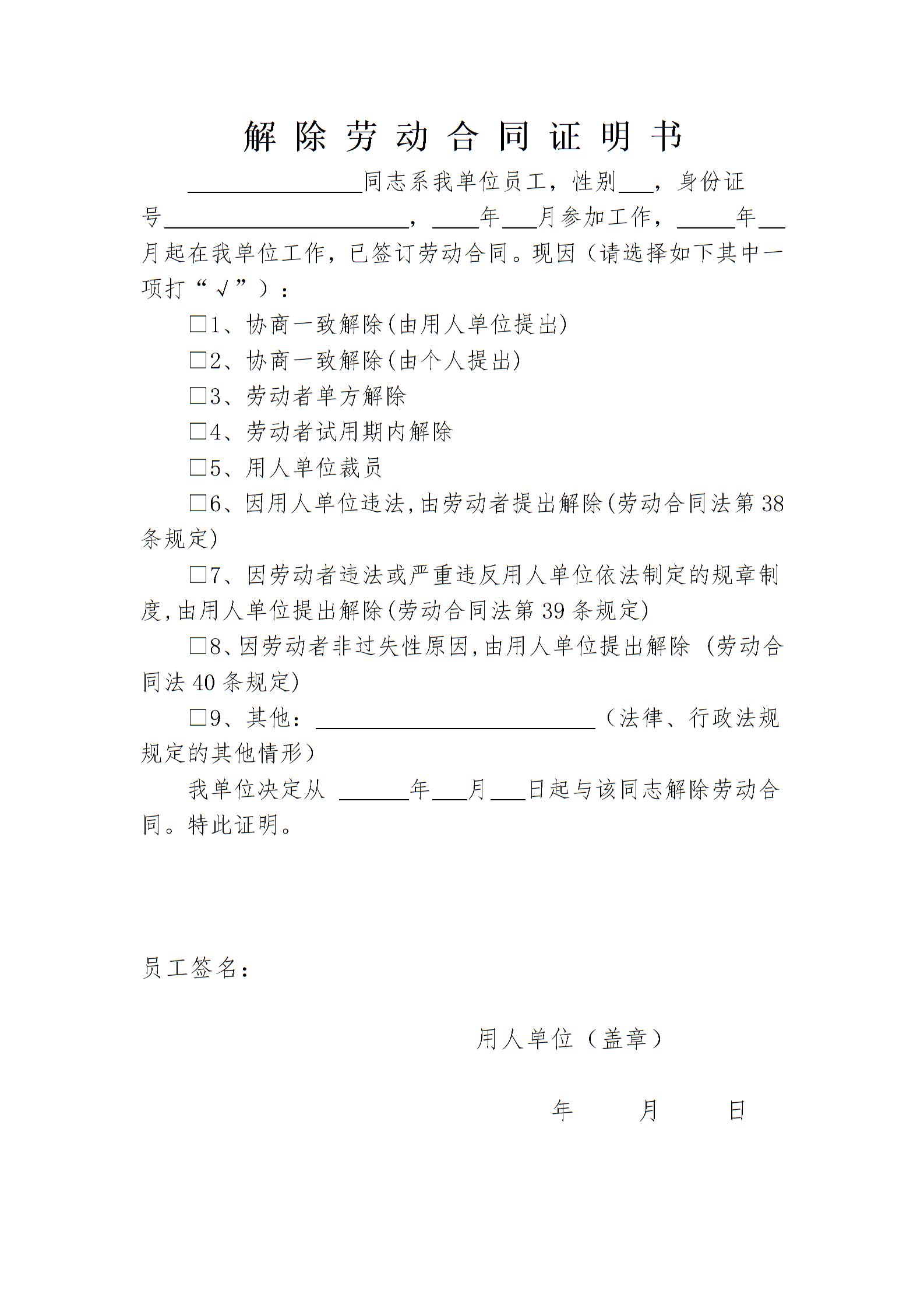 解除劳动合同证明书(一式三份)