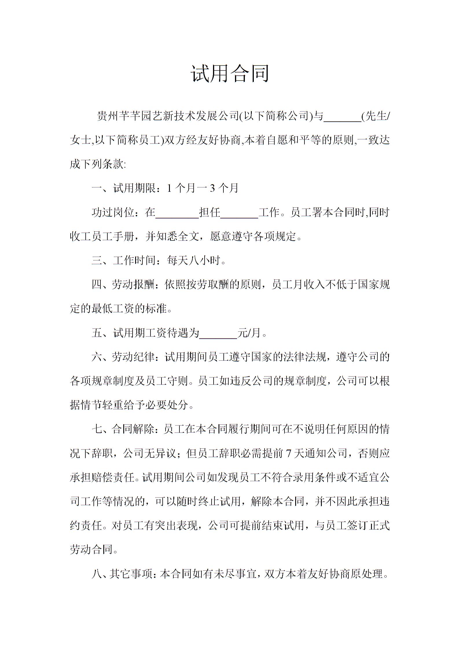 员工试用劳动合同