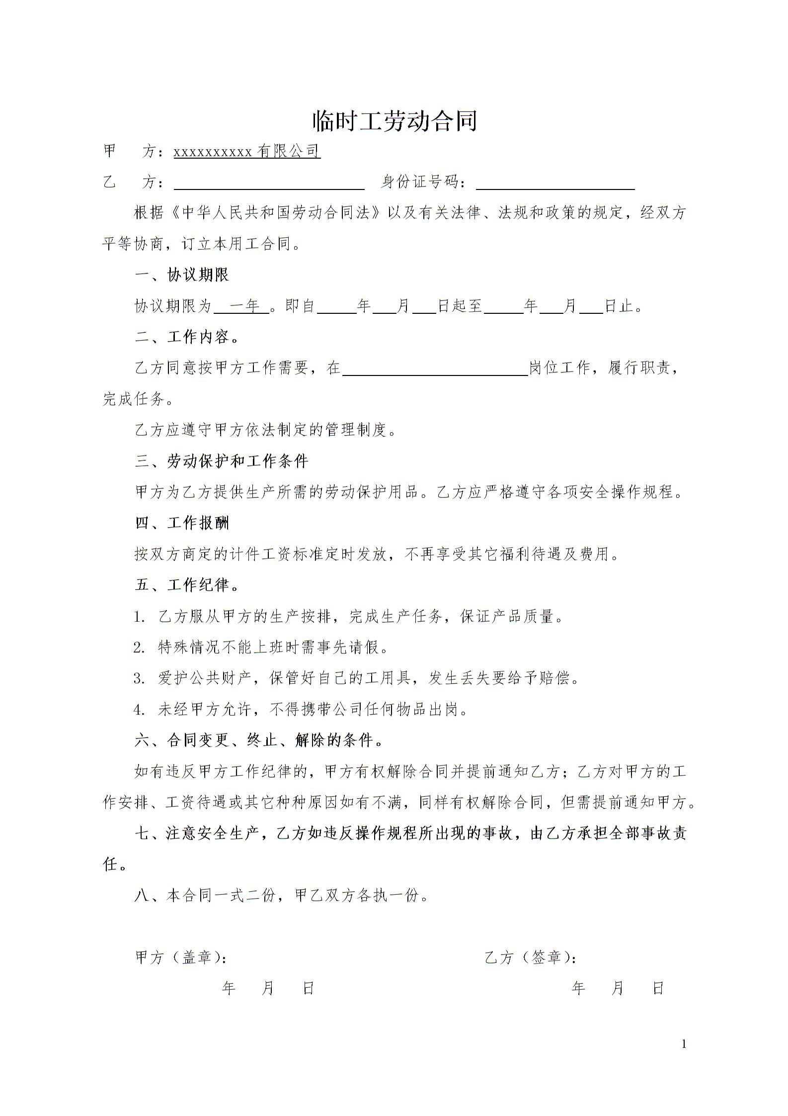 临时工劳动合同范本