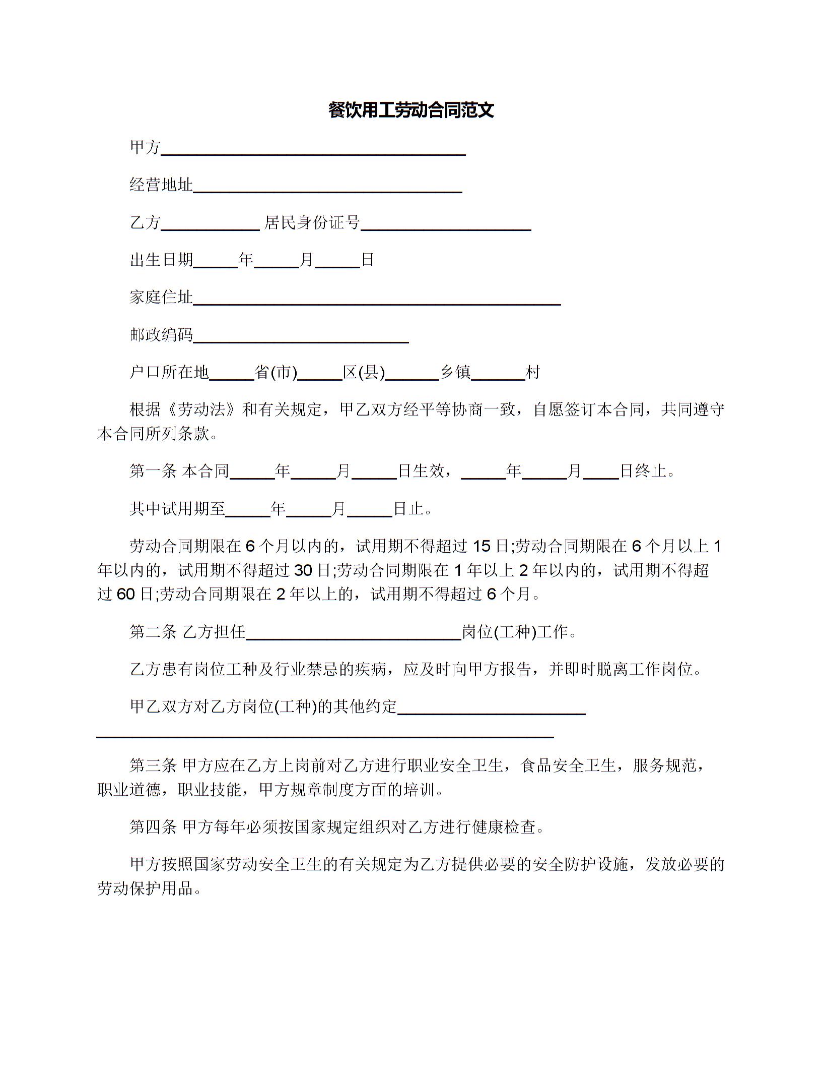 餐饮用工劳动合同范文