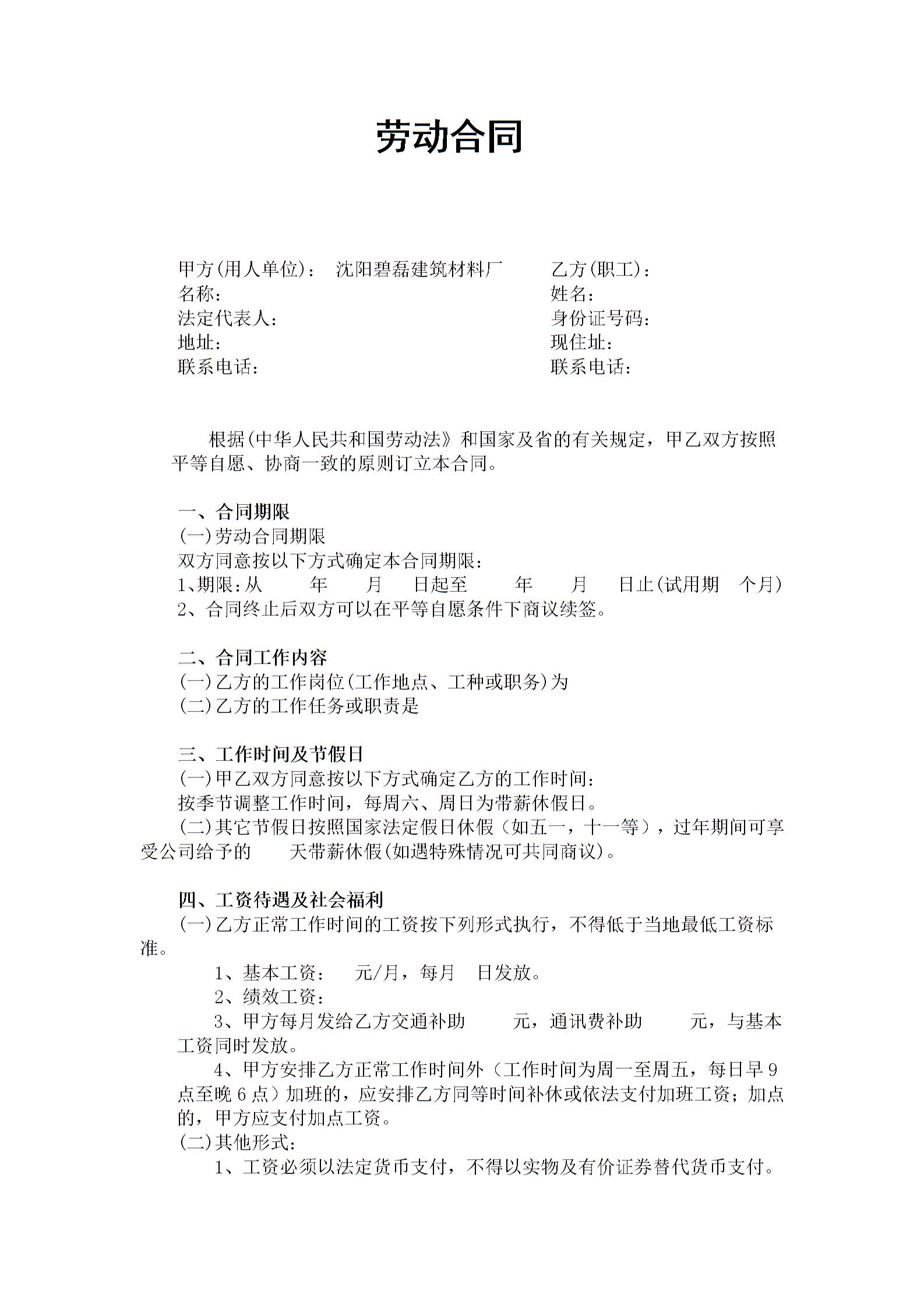 正规劳动合同范本