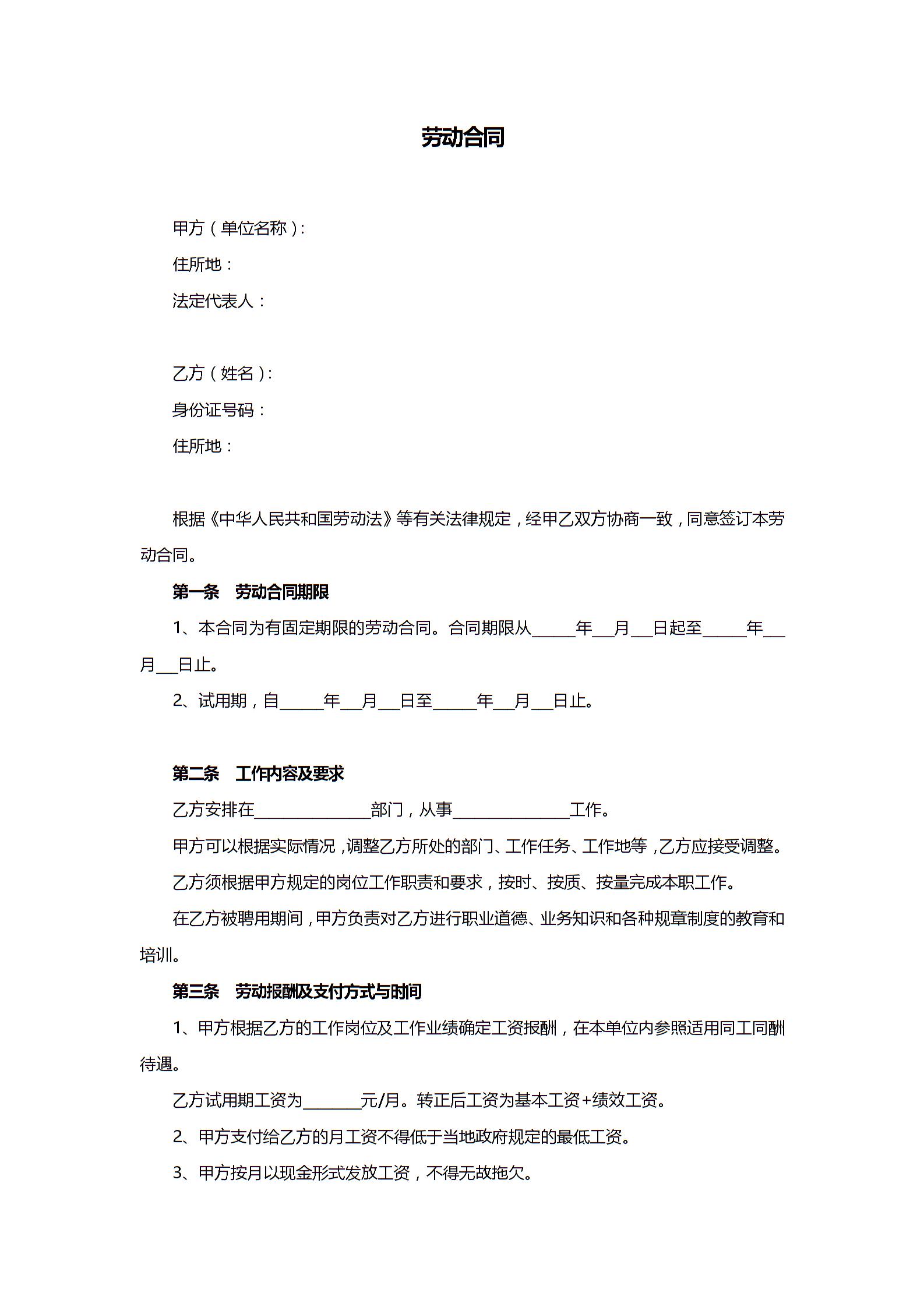 试用期劳动合同范本下载