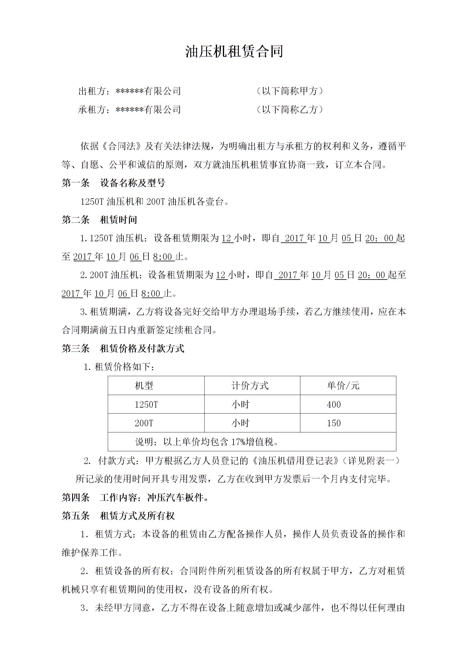 油压机租赁合同