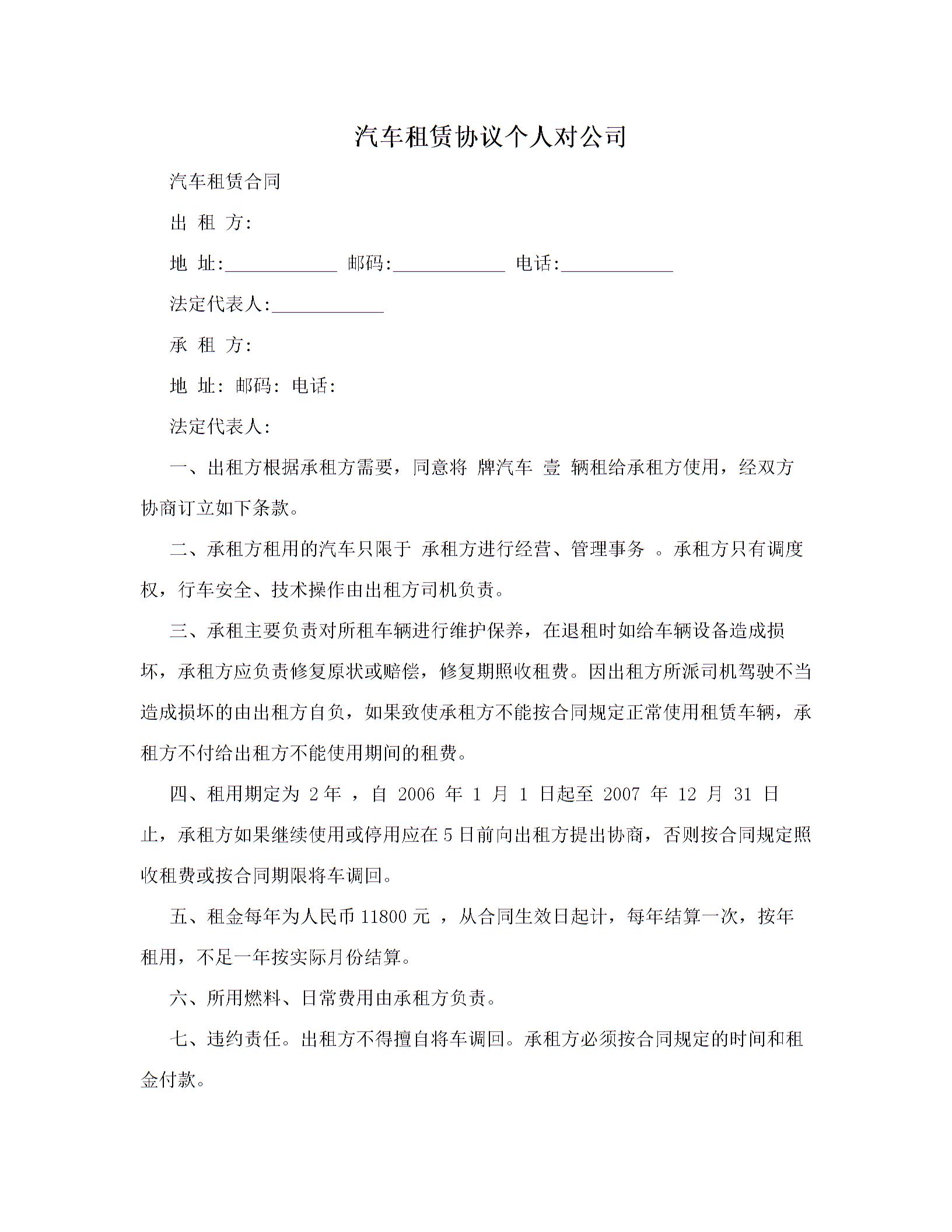 汽车租赁协议个人对公司