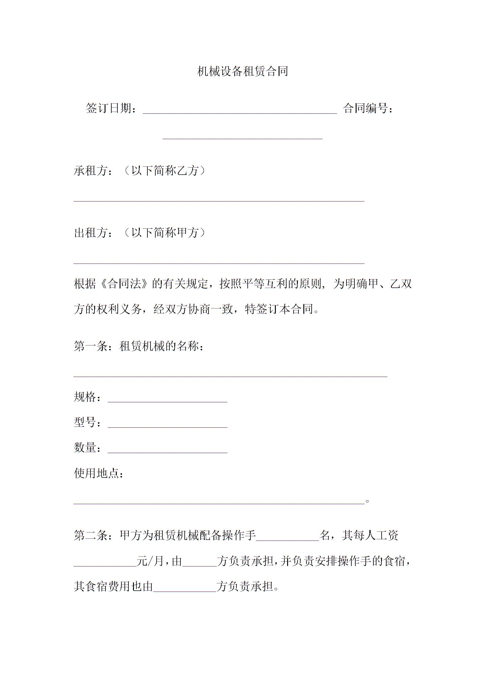 机械设备租赁合同模板