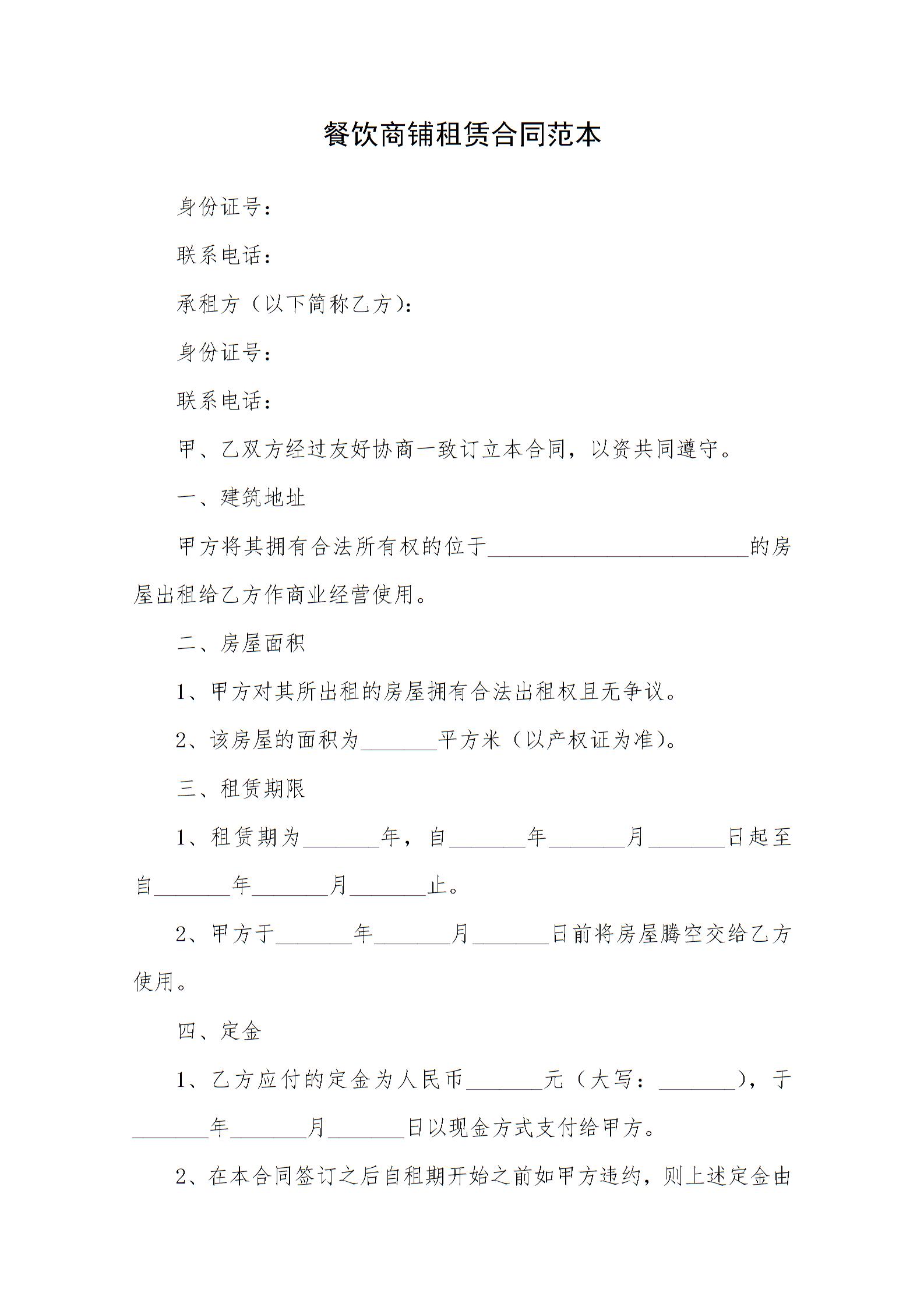 餐饮商铺租赁合同范本