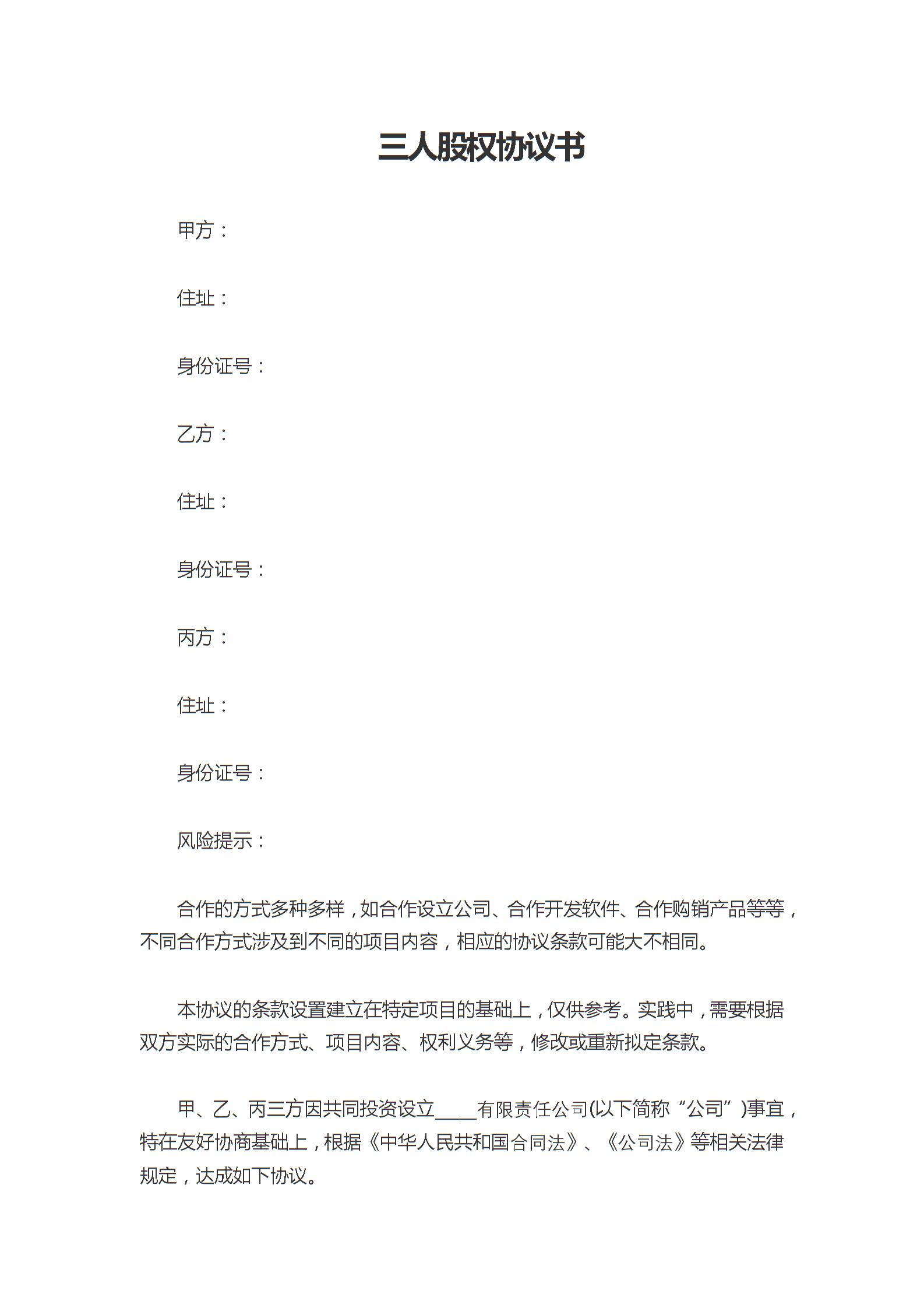 三人股权协议书范本