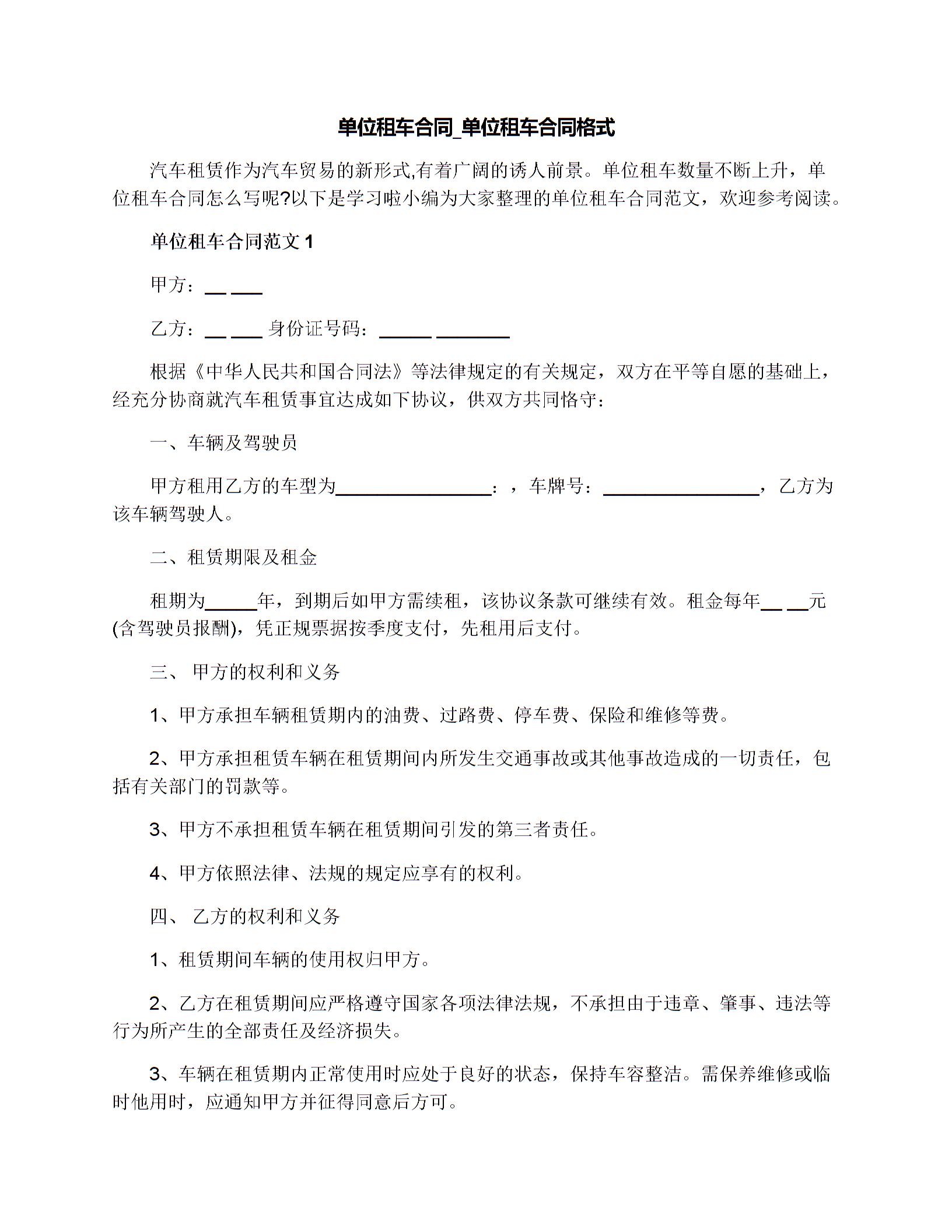 单位租车合同格式