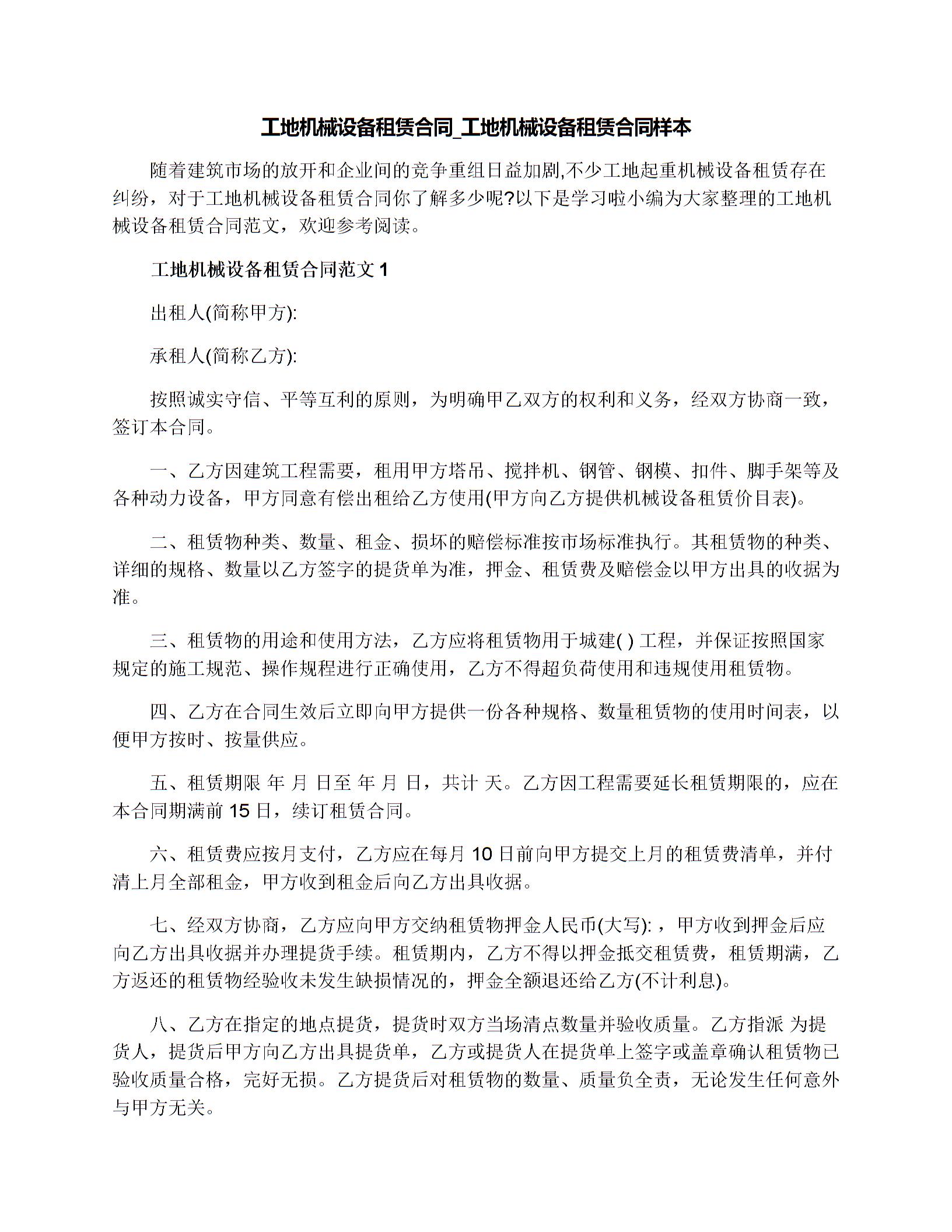 工地机械设备租赁合同样本
