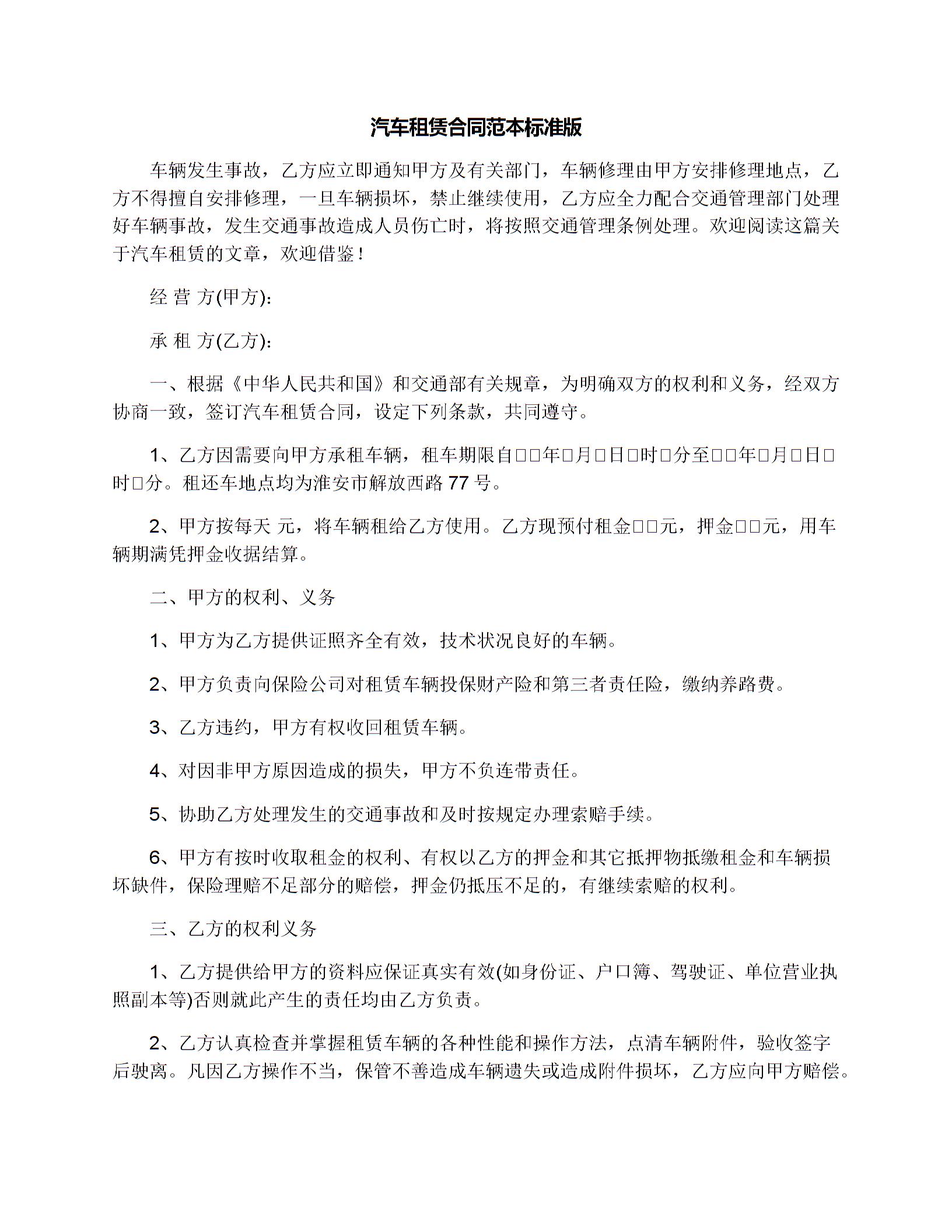 汽车租赁合同范本标准版