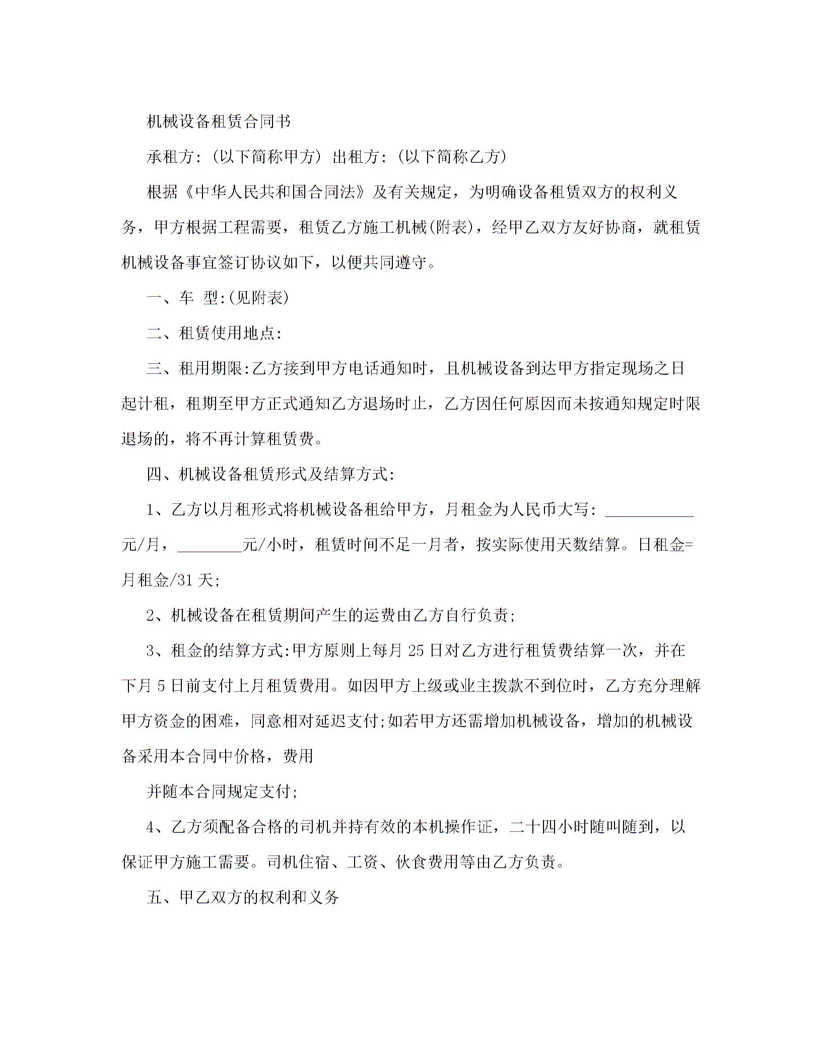 机械设备租赁合同范本