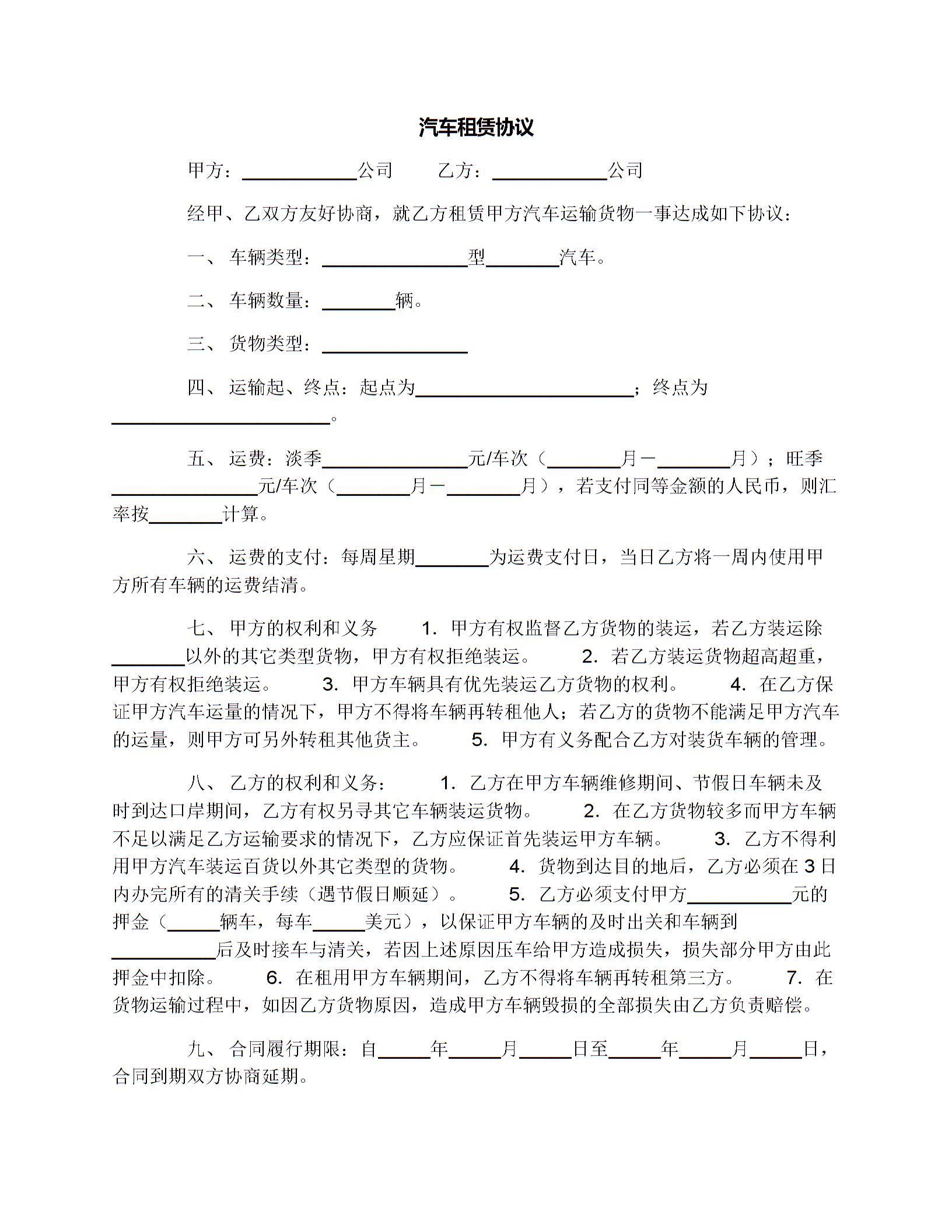 实用汽车租赁协议