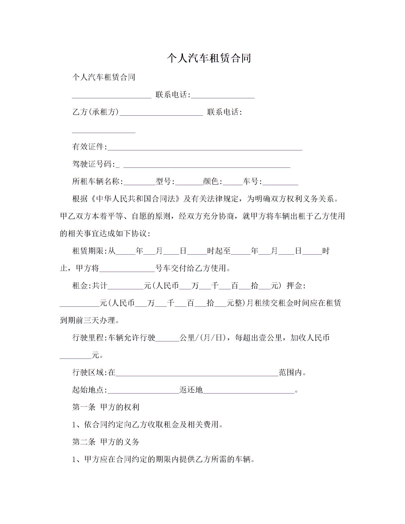 个人汽车租赁合同