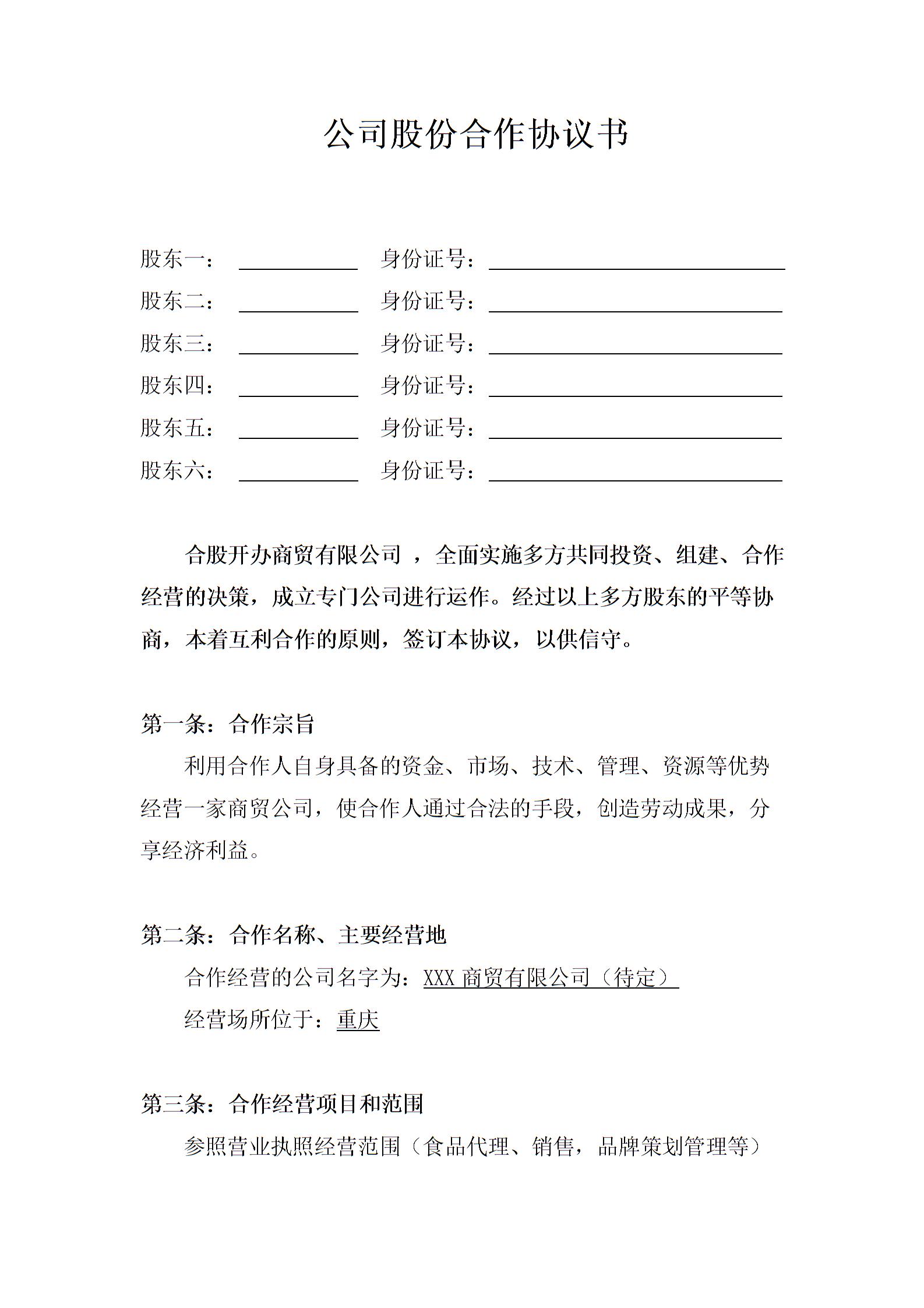 公司股份合作协议书(多人合伙)