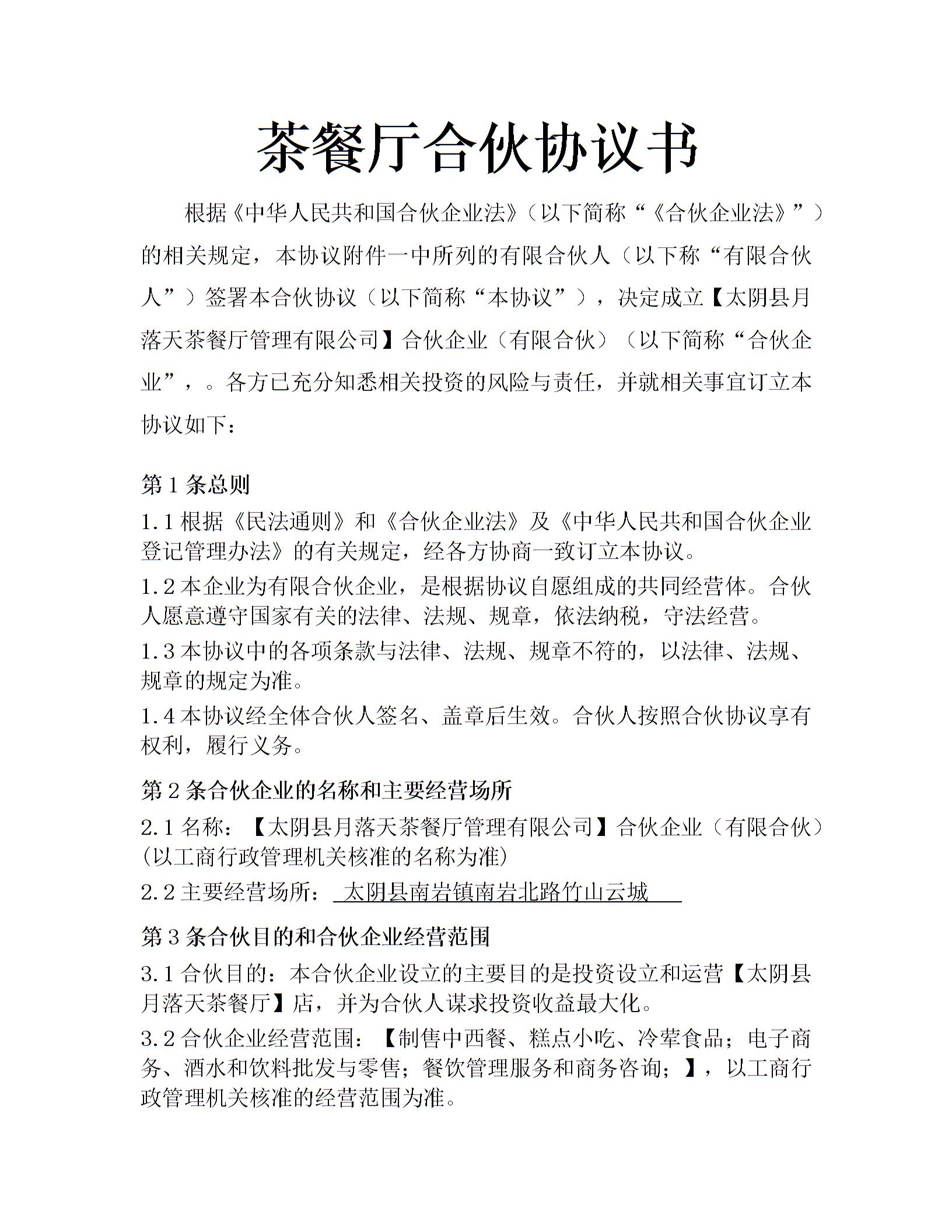 茶餐厅合伙协议书