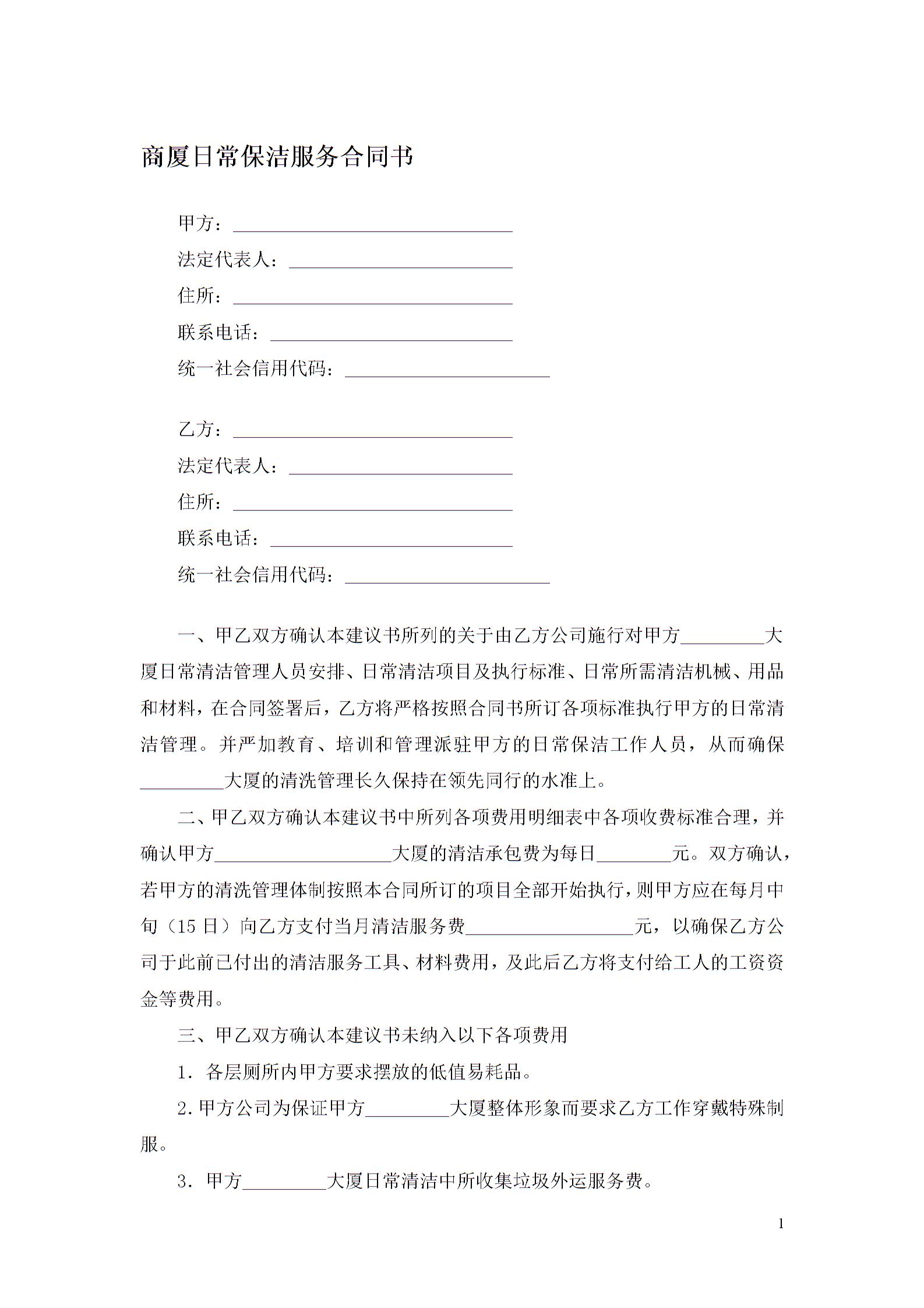 商厦日常保洁服务合同书