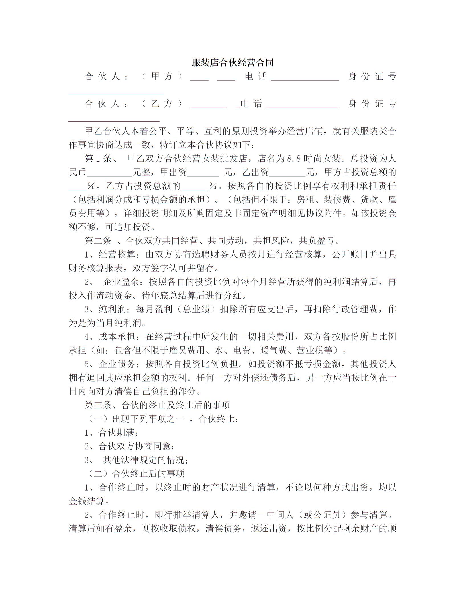 服装店合伙经营合同